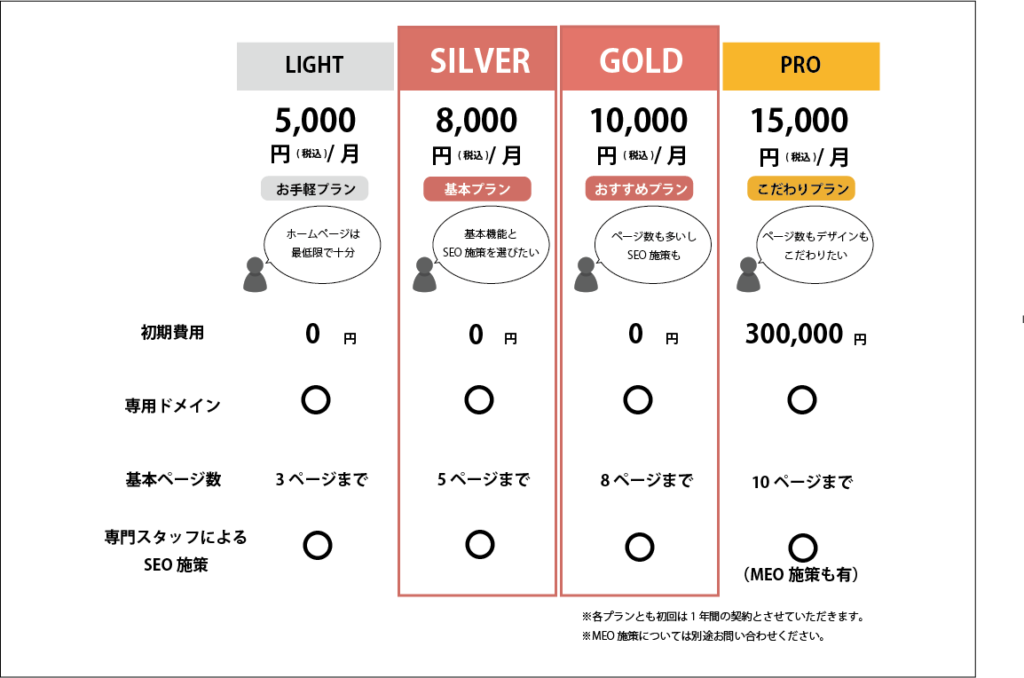 良質なホームページを、継続的に。 初期費用0円※1のサブスクでホームページを制作 スマホにも対応デスクトップ、タブレットも可 専用ドメイン取得WEB上の資産となり、信頼性向上も SEO対策有り※2様々な顧客層への集客が可能に スマホ対応で見やすく、美しいデザイン制作、初期費用不要かつ低コストで始められる月額制プラン、更新もスタッフにお任せできる顧客対応など、ウェブサイトに必要なサービスを標準で提供しています ※1 月額5,000円~※2 検索エンジン最適化:検索エンジンのオーガニックな 検索結果において、特定のウェ ブサイトが上位に表示されるよ う、ウェブサイトの構成や記述 などを調整すること。 「Web制作のサブスク」とは 料金プラン レスポンシブ対応 サンプルページ 「どうしてこんなに安価に作れるの?」 サブスクとは? サブスクリプション(Subscription)の略称。月額や年額といった定額料金を支払うことで一定期間、商品やサービスを利用できる仕組み。 ❶クライアントからの画像・情報提供 画像や情報はクライアントであるお客様から提供をしていただきます。 ❷福祉事業の一環 WEB制作は福祉事業の一環で行っております。 Pricing Lists SUMPLE PAGE ARCHITECTURE 建築業A Simple 建築業B Natural 建築業C Desinable 建築業専用ページ RESTAURANT レストラン 肉バル 高級店 飲食業専用ページ SCHOOLS 英会話教室 料理教室 パーソナルジム スクール事業専用ページ ARCHITECTURE 建築業A Simple 建築業B Natural 建築業C Desinable 建築業専用ページ RESTAURANT レストラン 肉バル 高級店 飲食業専用ページ SCHOOLS 英会話教室 料理教室 パーソナルジム スクール事業専用ページ ※現在は上記の3種類ですが、ご希望の業種がございましたらご相談ください。 「どうしてこんなに安価に作れるの?」 「どうしてこんなに安価に作れるの?」 「どうしてこんなに安価に作れるの?」 画像と情報の提供は全てお客様にしていただきます 福祉事業の一環として行っています これらの理由から、必要なサービスを安価で提供できます これらの理由から、必要なサービスを安価で提供できます