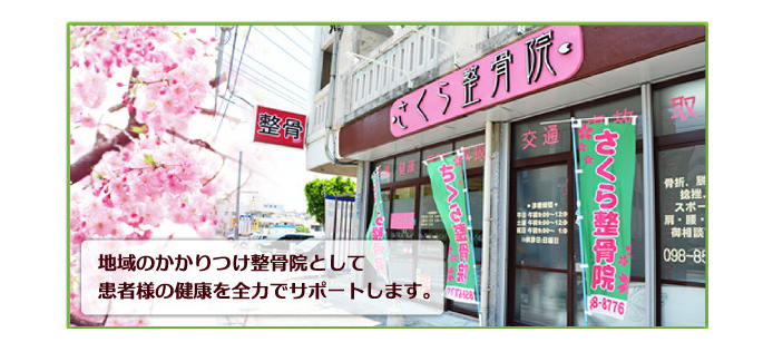 那覇市(豊見城市)の整骨院、さくら整骨院ではスポーツ選手、一般スポーツ愛好家を対象としてケガからの早期現場復帰をお手伝いしています。また交通事故でのムチウチ・腰痛・関節痛、残ってしまった後遺症に対する治療にも力をいれております。地域のかかりつけ整骨院として、患者様の視点に立ち、優しい・わかりやすい説明を心がけております。那覇市・豊見城市で整骨院をお探しの患者様、体の痛み・不調でお悩みの患者様、お気軽にさくら整骨院にご相談ください。